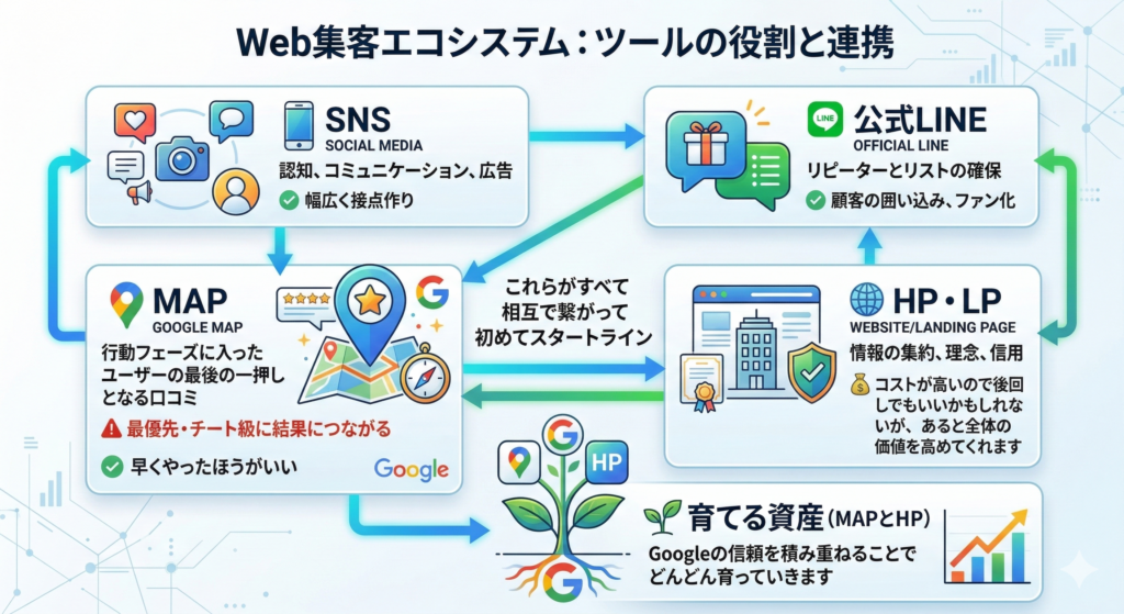- HP・LINE・MEOと組み合わせることで集客は変わります